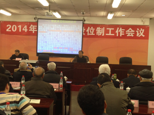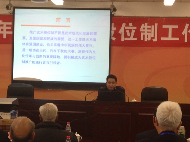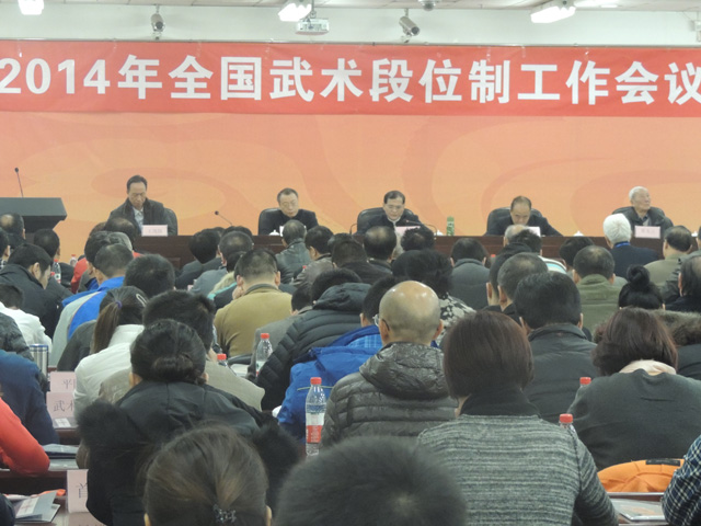 会议现场 11月26日,2014年全国武术段位制工作会议在京召开,国家体育总局武术运动管理中心主任、中国武术协会主席高小军,国家体育总局武术运动管理中心副主任、中国武术协会副主席邵世伟,国家武术研究院专家委员会主任蔡龙云等领导专家,来自全国27个省市自治区的中国武术协会一级会员单位、武术段位制推广试点单位及相关高校代表共200余人参加了本次会议。 国家体育总局武术运动管理中心主任、中国武术协会主席高小军 国家体育总局武术运动管理中心副主任、中国武术协会副主席邵世伟 国家武术研究院专家委员会主任蔡龙云 国家体育总局武术运动管理中心主任、中国武术协会主席高小军在会上作了《扎实推进武术段位制十年规划深入发展》的工作报告。高主任在报告中对近五年来武术段位制工作所取得的建设性成果进行了梳理和总结,并就2014年《武术段位制推广十年规划》的贯彻实施情况作了详细介绍,对2015年的工作进行了安排部署。 近五年来武术段位制工作所取得的建设性成果主要在以下十个方面: 一是制度化建设逐步配套,编制了《中国武术段位制手册》。为照章办事、遵守流程、规范化、标准化开展段位制工作奠定了基础。 二是在全国范围内构建起了两级管理、三级办公、层层设点的段位制组织网络。各级段位制组织机构逐步规范化、专业化。 三是段位制教材、系列服装、标识、考试点、国考等标准化产品逐步确立。 四是确立了国内六进、国际三进的武术段位制推广工作目标,并按照十年规划全面展开实施。 五是形成了国家认证资质的指导员、考评员队伍。 六是形成了全国武术段位制培训教学、考试晋段的标准化体系。 七是确立了通过“国考”考取高段位七段,并将“国考”与大赛融合的制度。 八是召开全国段位制工作年度会议已形成制度。 九是基层武术段位考试点发展成既是方便当地习武者考取段位的考场,也是组织段位拳培训、早练、晚练的训练场。 十是《武术段位制推广十年规划》纳入国家体育发展战略,武术段位制已列入全民健身大群体格局,知晓率和参与率大幅度提高。 会议现场 对于如何做好2015年的工作,高小军主任也作出了详细的安排,主要在以下十个方面: 一是做好武术段位制试点省的工作;